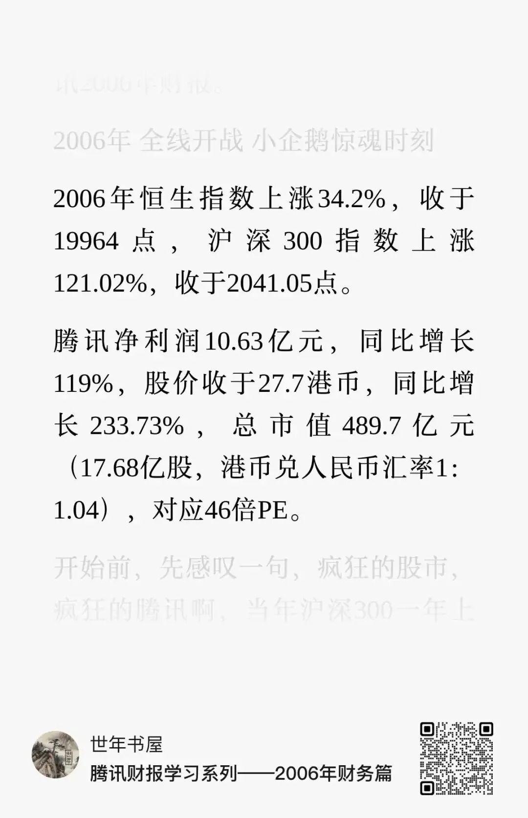 一是慈善捐款1200万,二是2006年初收购的公司所带来的无形资产减值了3230万以及之前投的一家初创游戏公司减值了2380万。这两家公司没有具体披露,不过问了元宝,猜测前者为深圳网域(《QQ华夏》的开发商),后者为 北京永航科技(《QQ炫舞》的开发商)