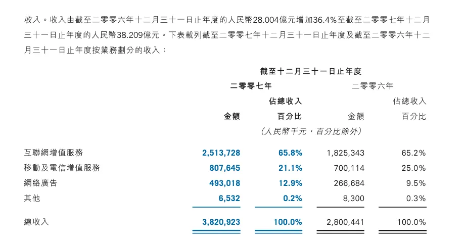 整体来说,从三大业务来看,2007年的腾讯是欣欣向荣的一年,网络增值业务继续高增长,移动及增值服务保持增长,广告业务成为新的增长点。