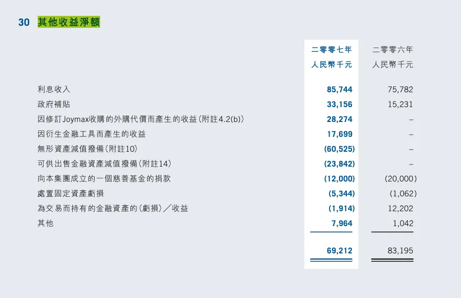其他收益净额,2007年这块是收入了6921万,其中收入方面主要是两块: