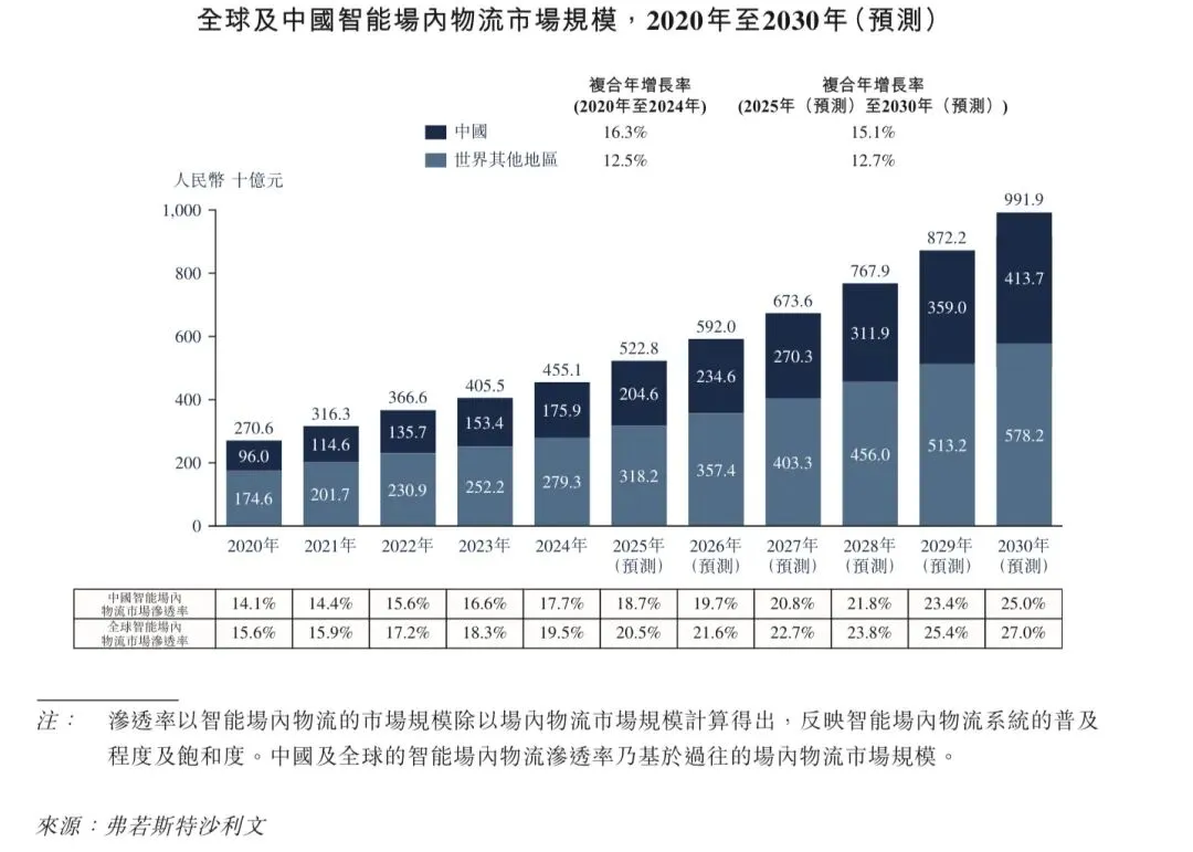 智能场内物流是指通过集成先进的设备系统(如穿梭车、AMR/AGV及输送分拣机器人)以及软件架构及物联网技术等,实现场内物流操作的现代化。相较于非智能场内物流解决方案,智能场内物流解决方案提供更高的灵活性及适应性,实现在动态环境中的实时调整及优化,并可大幅提升营运效率并降低劳动成本。相较于非智能场内物流解决方案,智能场内物流解决方案估计将提供30%至50%的营运效率提升并降低40%至60%的劳动成本。这些优势推动了智能场内物流解决方案渗透率的稳步增长,全球渗透率预计将从2024年的19.5%增长到2030年的27.0%。同期,中国的市场渗透率预计将从17.7%增长到25.0%。
