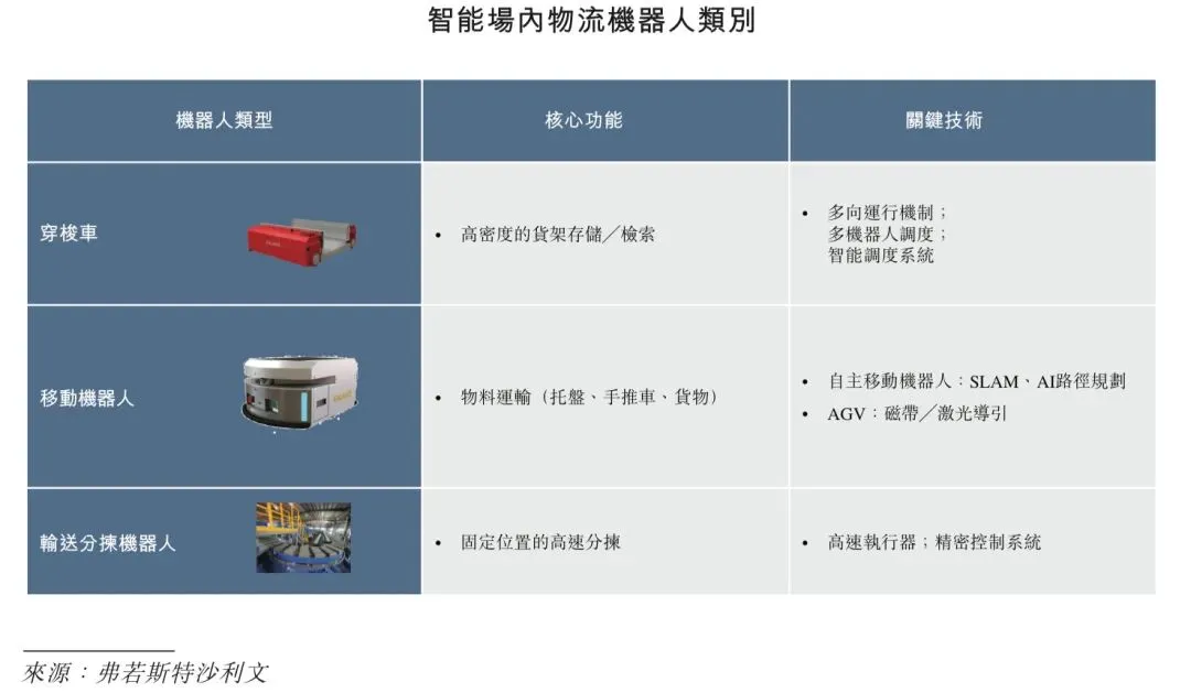 移动机器人(AMR/AGV):AMR通常利用SLAM及二维码技术导航,并通过应用AI增强其动态路径规划能力,使其能够灵活搬运物料(如托盘及料箱),而AGV则依循预先定义路径可靠搬运该等物料。极窄巷道自主移动机器人(VNA AMR)是一种专为通道非常狭窄(宽度通常小于1.8米)的仓库环境而设计的AMR。VNA AMR利用高精度定位和导航技术,在有限的空间内自动在货架之间搬运和拣选物品。该等AMR配备升降系统,亦可存取多层垂直存放的货物。相比之下,其他 AMR则强调灵活性,更适合开放空间及频繁变化的物流中心或生产车间。VFR为VNA的一种,而VNA为AMR的一种。