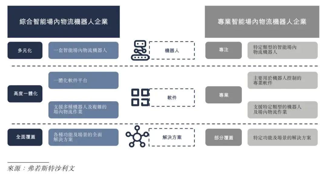 智能场内物流机器人行业的企业一般分为两种经营模式:专业智能场内物流机器人企业及综合智能场内物流机器人企业。专业智能场内物流机器人企业着重于提供特定类型的机器人,采用专业及规模驱动的策略扩大市场占有率。综合智能场内物流机器人企业则通过建立具备一体化软件及解决方案能力的多元化机器人产品组合,覆盖场内物流关键流程,满足用户在不同场景的多样化需求,从而提升竞争力。