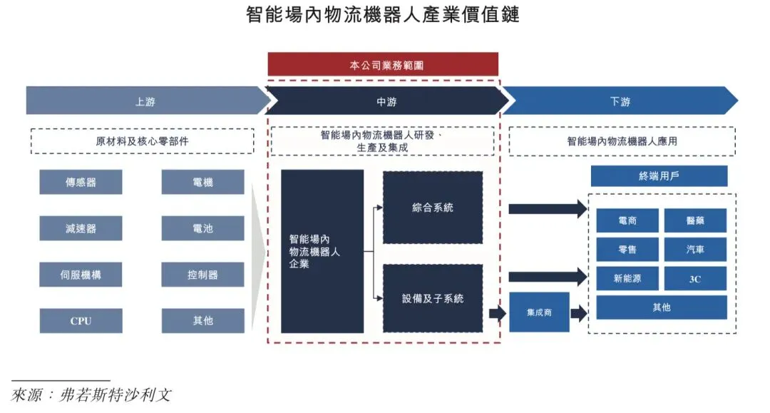 智能场内物流机器人价值链包括三大环节:上游由零部件制造商主导,承载核心硬件(传感器、电机、减速器及其他机械 ╱ 电子零件)的供应,中游依赖解决方案提供商,下游衔接部署。其中,中游环节作为价值创造的中流砥柱,聚焦三大核心活动,即自有技术研发、硬件生产以及机器人部署和系统设计。依托于硬件与软件的无缝集成和此类设计能力,我们的下游部署兼容多种规模,可实现较小规模的机器人部署和构建大规模的综合系统。
