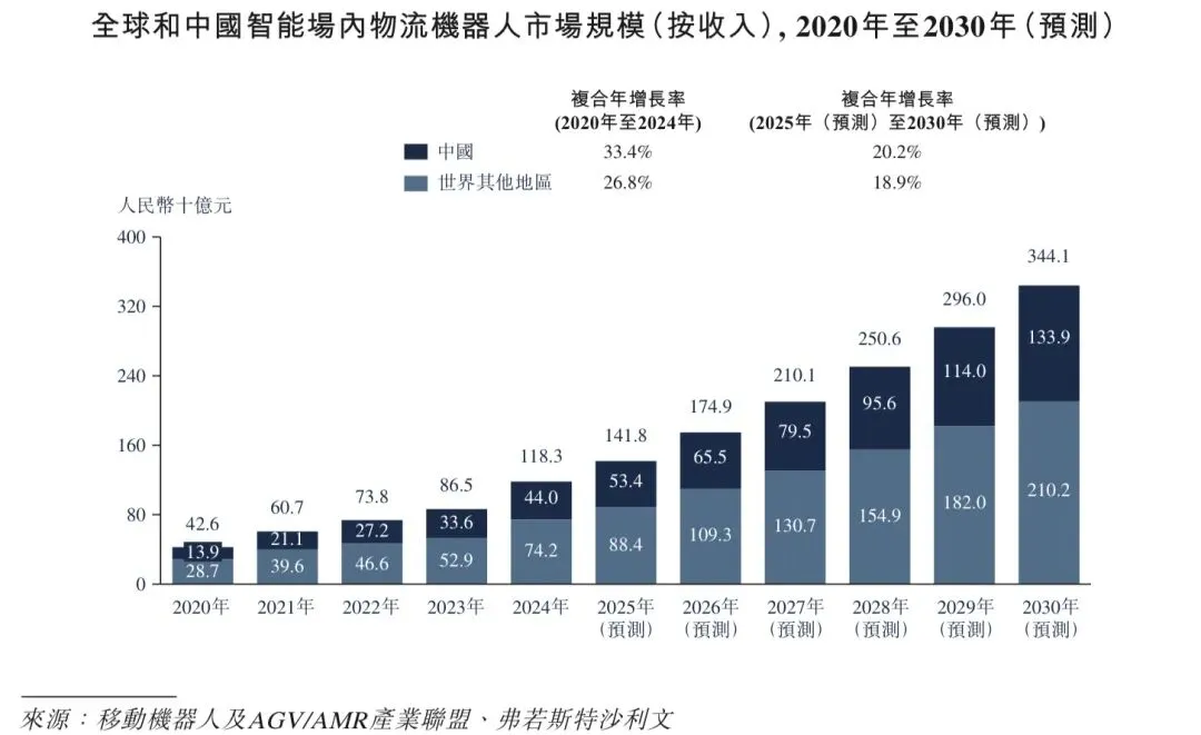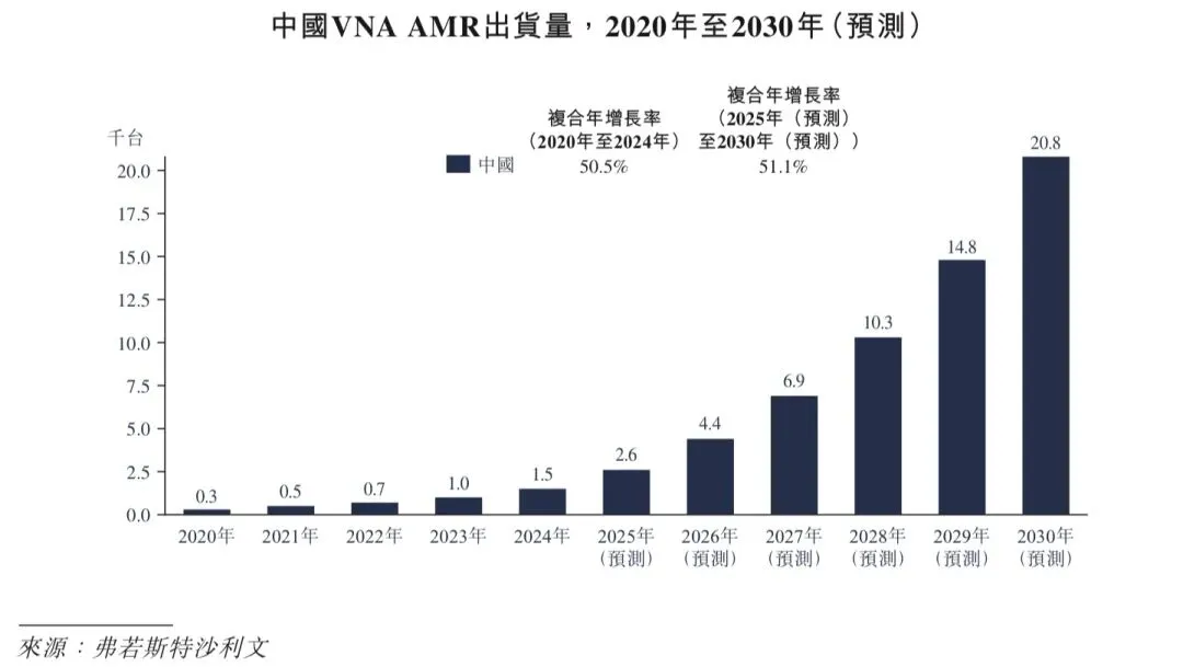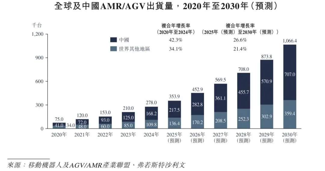 AMR/AGV是智能场内物流行业增长的重要催化剂。AMR/AGV出货量从2020年的75.0千台增长至2024年的278.0千台,且预计2030年的全球出货量将达到1,066.4千台。该等快速增长主要由于制造业和物流行业对自动化技术的广泛应用。中国的AMR/AGV出货量从2020年的41.0千台攀升至2024年的168.2千台,期内复合年增长率高达42.3%。展望未来,AMR/AGV需求预计将保持强劲,且出货量预计将在2030年突破707.0千台。全球及中国出货量持续增长凸显了各个行业对智能场内物流解决方案不断增长的需求,反映了行业对于提升制造和流通营运的效率和灵活性的迫切需求,彰显了AMR/AGV在优化物料搬运和提升营运效能方面的关键作用。