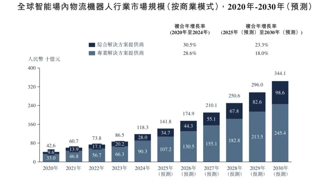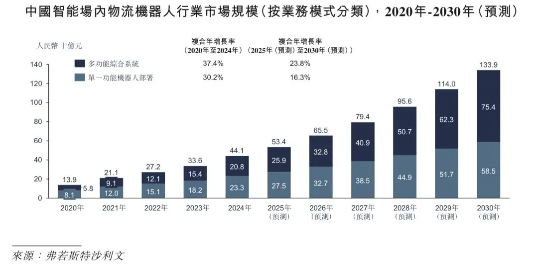 单一功能机器人部署涉及使用自主研发的机器人执行拣货或运输等特定任务。多功能综合系统将该等机器人与第三方产品集成,以处理多种操作,例如完整的仓库自动化。自2020年到2030年,单一功能机器人市场规模由人民币81亿元扩大至人民币585亿元,而多功能机器人市场规模增长更为迅速,由人民币58亿元增至人民币754亿元,凸显行业向多功能综合系统解决方案的强劲转变。