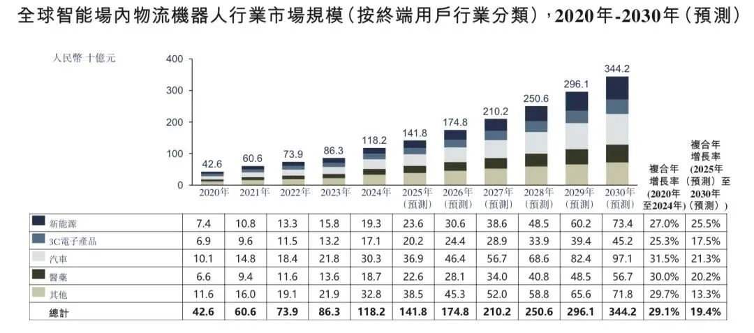智能场内物流机器人市场服务于多个终端用户行业,其中汽车、新能源及医药是最主要的应用领域。全球智能场内物流机器人行业的增长主要得益于下游应用需求的不断增长。例如在汽车业,向智能制造的转变以及对更高生产效率及灵活性的需求正在推动先进场内物流解决方案的采用。于2024年,智能场内物流机器人供应商在汽车制造领域创造收入人民币303亿元,新能源领域为人民币193亿元,及医药领域为人民币187亿元,分别占总收入的25.6%、16.3%及15.8%。在预测期内,汽车、新能源及医药的市场份额预计将继续上升,到2030年分别达到28.2%、21.3%及16.5%。锂电池行业是新能源领域的一部分。受新能源汽车销售增长放缓、产能暂时过剩等因素影响,锂电池行业产能扩张步伐明显放缓,降低了下游产业对智能场内物流机器人的需求。