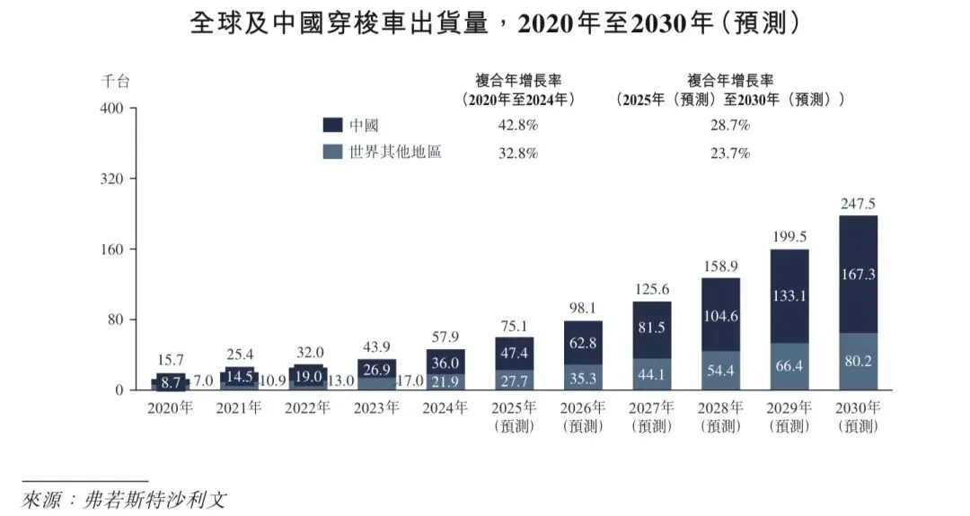 穿梭车在智能场内物流市场发展中发挥着举足轻重的作用。全球穿梭车出货量从2020年的15.7千台稳步增长至2024年的57.9千台,并预计将于2030年达到247.5千台,2025年至2030年间复合年增长率为26.9%。强劲的增长反映了市场对高密度存储和高效的货到人系统不断增长的需求。在高密度自动化存储系统需求增长的推动下,穿梭车在中国场内物流市场中所占份额亦日渐显著。2020年至2024年,中国穿梭车出货量由8.7千台增长至36.0千台,复合年增长率达42.8%,并预计将于2030年达到167.3千台。