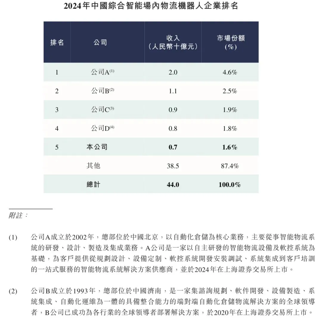 全球智能场内物流机器人市场仍然相对分散,参与竞争的既有综合系统提供商,也有专业厂商。综合智能场内物流机器人企业通过整合存取、分拣和拣选、输送及搬运作业中的多机器人系统来提供端到端系统,而专业厂商则通过在特定机器人类别中的深厚专业知识来实现市场差异化。竞争格局中还涵盖经营非核心但具有商业意义的智能场内物流机器人业务的企业。在中国市场,前五大综合智能场内物流机器人企业合计占有12.6%的市场份额,而凯乐士科技凭借专有的机器人产品和系统,以及为行业领先企业实施先进自动化解决方案的良好业绩,已跻身市场前五名,市场份额为1.6%,由此确立了显著的市场地位。不计及下列五大领先企业,估计市场上约有100家其他综合智能场内物流机器人企业。