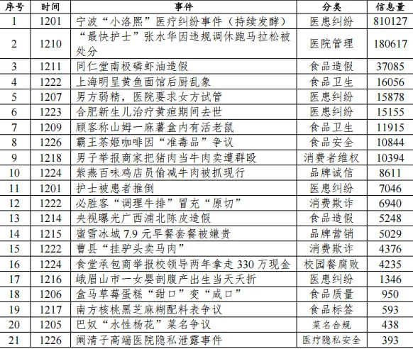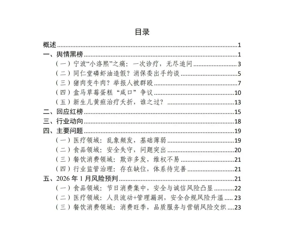 12月,食品、健康及医药领域负面舆情集中爆发,公众信任持续承压。医疗乱象频发,行业信任基础动摇:宁波“小洛熙”术后离世、合肥新生儿黄疸治疗夭折、峨眉山女婴剖腹产当日死亡等医疗纠纷接连发酵,引发社会对医疗安全与监管缺位的深度质疑。同时,阚清子隐私泄露、“最快护士”违规参赛、医院不当生殖诊疗建议等事件,进一步加剧了医患间的不信任。食安造假与品质失控,监管漏洞凸显:同仁堂“南极磷虾油”核心成分检出为零、央视曝光陈皮造假、上海明呈黄鱼面馆使用过期食材、山姆麻薯盒现活鼠、盒马草莓蛋糕口味异常等事件,暴露出从生产到流通全链条的监管薄弱环节。此外,霸王茶姬咖啡因争议、南方黑芝麻糊配料表争议等也引发广泛关注。消费欺诈与维权困境,权益底线屡被触碰:必胜客“假原切牛排”、曹县“挂驴头卖马肉”、紫燕百味鸡“偷肉”风波,以及男子举报“猪肉变牛肉”反遭群殴的恶性事件,折射出消费欺诈的顽疾与维权的艰难。跨界负面与品牌失范,引发社会深层关切:“校园餐”腐败案触碰教育民生底线;蜜雪冰城低价套餐反遭诟病、巴奴菜名争议等品牌营销翻车事件,暴露了企业在合规管理与社会责任上的短板。以下为舆情黑榜及典型案例分析。