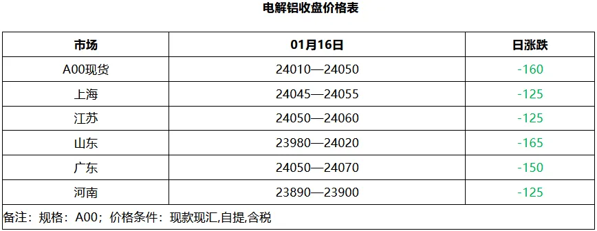 今日电解铝市场重心续跌,国内现货铝市场主流成交价格在23890-24070元/吨之间。期盘重心走低,现货跟进下行。沪铝上午低开后重心继续走弱,下午盘面重心回升。主力跌380元/吨至24085元/吨,近月跌355元/吨至24025元/吨。华东地区对2月贴水180元/吨,华南地区对2月贴水150元/吨。