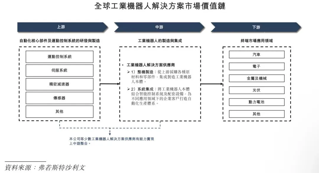 全球工业机器人解决方案市场的价值链由三大核心环节构成。上游环节涉及自动化核心部件及运动控制系统的研发与制造,例如运动控制系统、伺服系统、精密减速器及各类传感器。中游环节聚焦于工业机器人的制造与系统集成,而解决方案供应商提供定制化的编程及配套设备,以满足特定客户需求。在下游环节中,工业机器人解决方案应用于不同行业,包括汽车、电子、金属及机械、光伏、动力电池及其他。下表载列该等行业参与者的详情。
