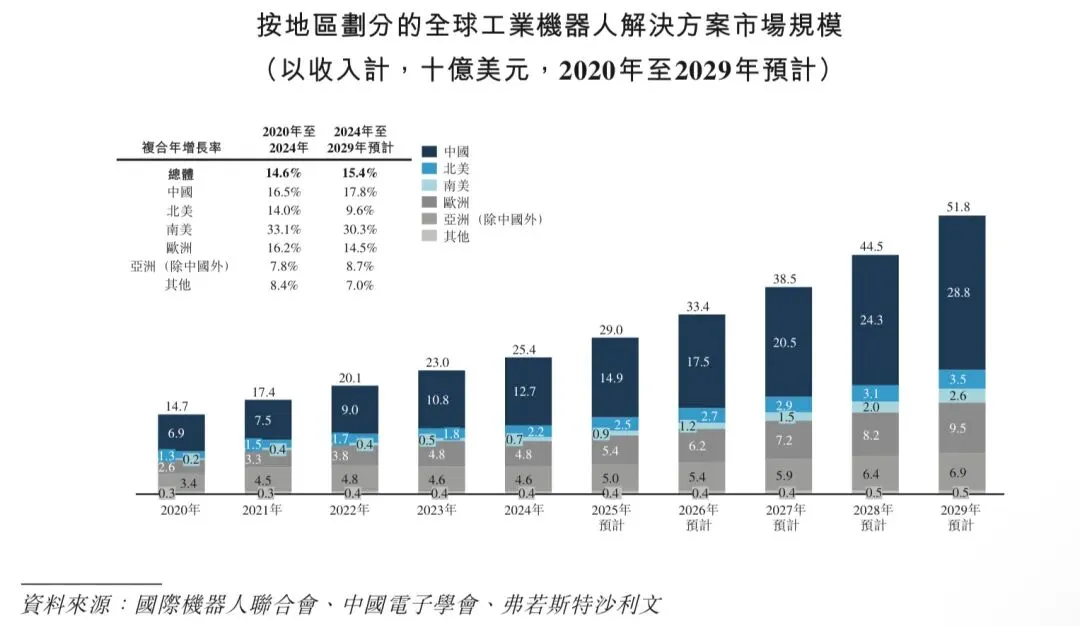 随着科技快速进步及应用领域的扩展,全球工业机器人解决方案市场近年来出现大幅增长。市场规模按收入计由2020年的147亿美元增加至2024年的254亿美元,2020年至2024年的复合年增长率为14.6%,并预期未来将维持强劲的增长率,预计收入将于2029年达到518亿美元,2024年至2029年期间的复合年增长率为15.4%。
