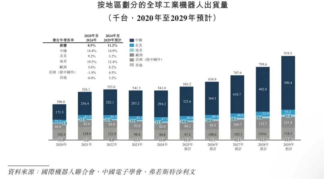 全球工业机器人出货量实现显著增长,从2020 年的39.0 万台增长至2024 年的54.10万台,复合年增长率为8.5%。于2023年及2024年,全球工业机器人出货量分别同比下降2.1%及0.1%,原因是各行业对自动化设备的需求普遍下降。中国市场是全球工业机器人出货量增长的主要驱动力。中国工业机器人出货量从2020年的17.15万台激增至2024年的29.42万台。这一显著增长使中国在全球工业机器人出货量的占比从2020年的44.0%增长至2024年的54.4%。