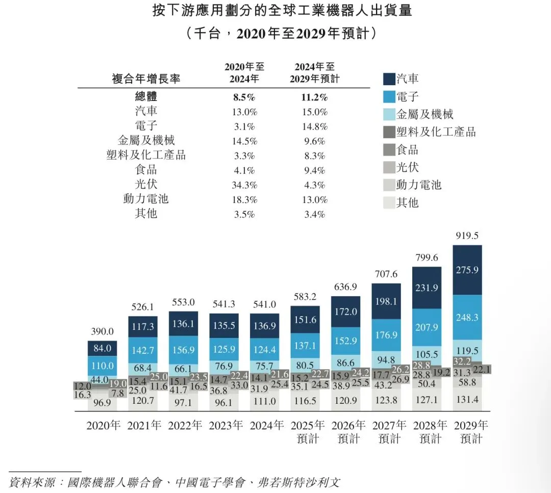 汽车、电子、光伏及动力电池领域属于已推动或预期将继续推动全球工业机器人出货量的关键行业。根据不同下游应用领域划分,全球工业机器人在汽车、电子、光伏及动力电池领域的出货量分别从2020年的8.4万台、11.0万台、0.78万台及1.63万台增长至2024年的13.69万台、12.44万台、2.54万台及3.19万台。受汽车行业智能技术应用日益广泛以及电子产品加速迭代的推动,制造企业对生产效率及精度的要求不断提高。因此,在相关行业工业机器人出货量预期将持续上升。预计至2029年,全球工业机器人在汽车及电子领域下的出货量将分别达到27.59万台及24.83万台,2024年至2029年期间的复合年增长率分别为15.0%及14.8%。