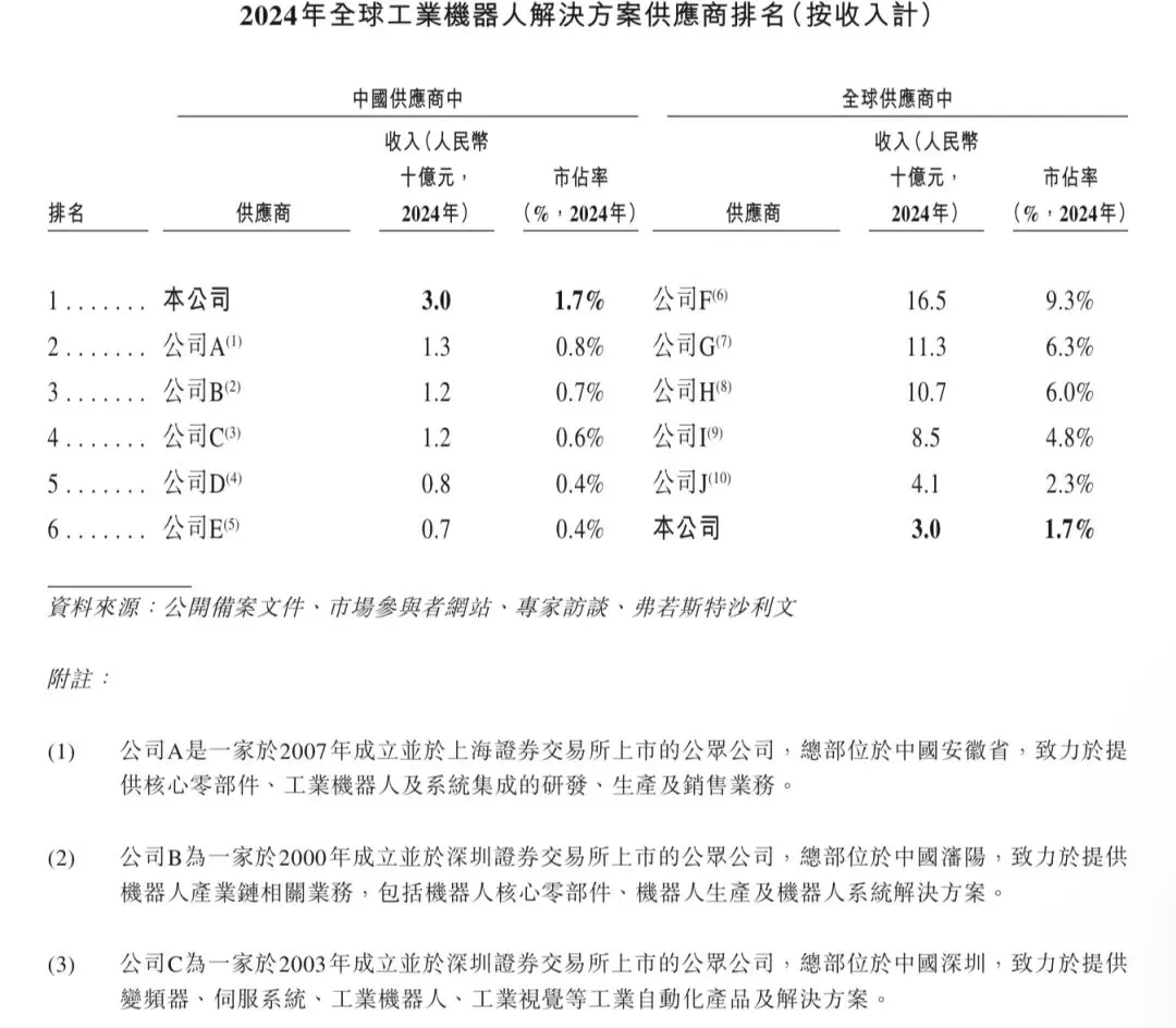 按2024年收入计,埃斯顿于全球工业机器人解决方案市场在国内供应商中排名第一,于全球工业机器人解决方案市场在全球所有供应商中排名第六。下表载列按收入计埃斯顿在全球工业机器人解决方案市场的排名及市场份额。
