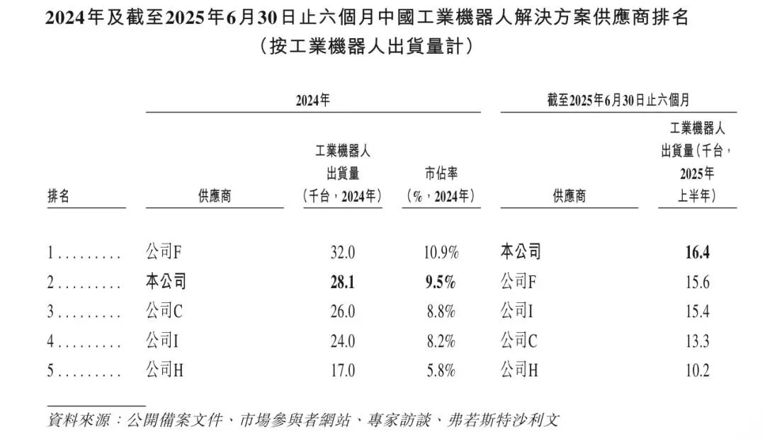按2024年工业机器人出货量计,埃斯顿于中国工业机器人解决方案市场排名第二,市场份额为9.5%。基于2025年上半年工业机器人出货量,埃斯顿于中国工业机器人解决方案市场排名第一。下表载列按工业机器人出货量计埃斯顿在中国工业机器人解决方案市场的排名及市场份额。