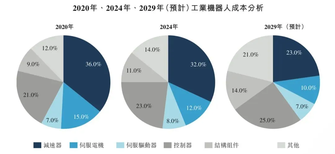 2029年,谐波技术的突破加上人形机器人的量产,预期可将减速器成本进一步降至23%。持续的伺服系统升级预期将使电机和驱动器的份额分别调整至10%和7%。同时,控制器成本预期将大幅上升至25%,而结构组件成本预期将上升至14%,反映传感系统及创新材料方面的持续技术进步。