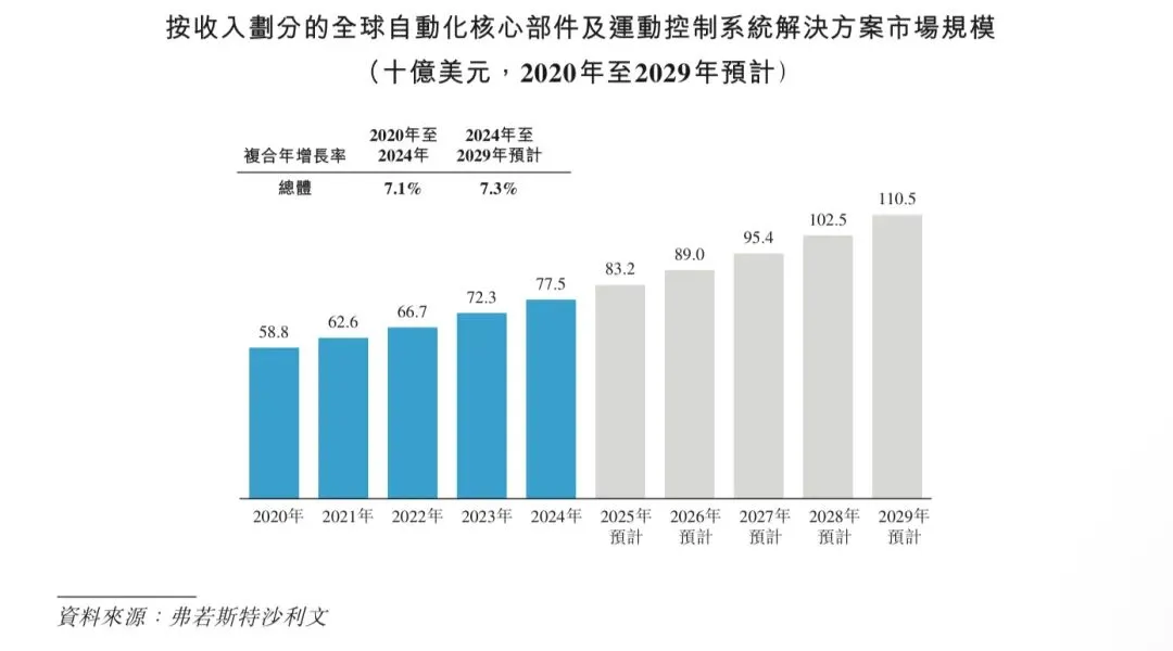 工业自动化是指利用先进的控制系统、信息技术及机器人,执行传统人工任务。随着近年来科技的显著进步,工业自动化在制造业及其他工业应用上提升了生产力及质量,同时通过减少对体力劳动的依赖,显著改善了安全状况。目前,工业自动化在全球多个行业广泛采用,按收入计算,2024年全球市场规模为5,096亿美元。全球工业自动化市场预计在可预见的未来将保持强劲增长,主要受汽车、电子、光伏及动力电池等行业日益广泛应用的推动,而这些行业制造工艺复杂,对自动化的需求强烈。在这些高度复杂的行业中,对更高精度、更高效率及更强可扩展性的需求,预计日后将大大推动工业自动化市场的扩张。全球工业自动化市场预计将在2029年达到7,247亿美元,2024年至2029年期间的复合年增长率将为7.3%。