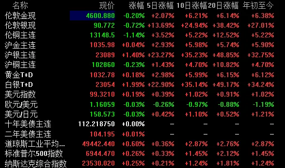 现货黄金价格下跌0.1%,收报每盎司4614.62美元,从纪录高位回调。现货白银价格下跌0.95%,收于每盎司92.36美元,暂时停止此前凌厉的涨势。