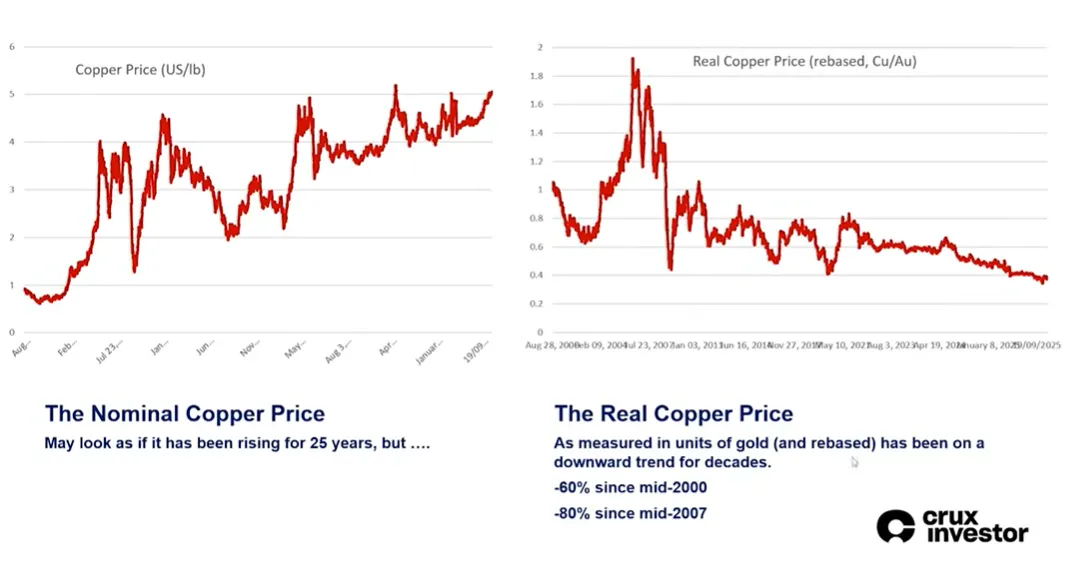 (名义铜价虽然已创下历史新高,但以黄金计价的真实铜价尚处于长期偏低位置)