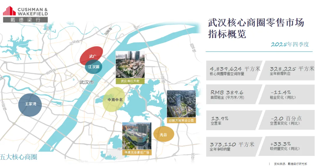 戴德梁行认为,2025年武汉商业地产市场在挑战中展现出韧性:零售市场通过存量调改与以价换量实现企稳,消费升级驱动业态结构优化;写字楼市场虽面临供需失衡压力,但运营商多元化破局与TMT行业的支撑为市场注入新动能。