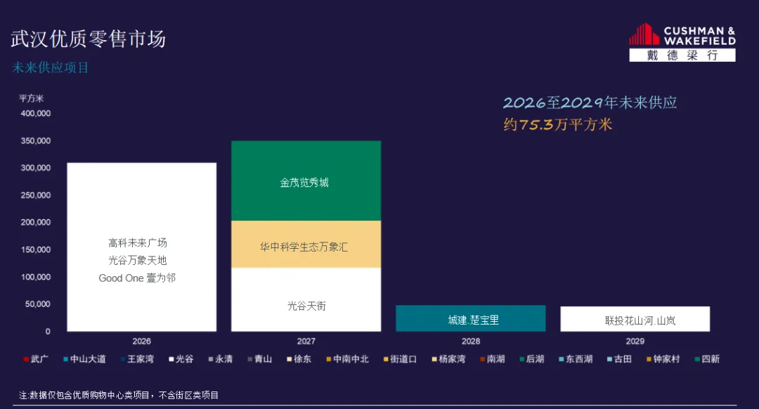 戴德梁行预测,未来四年武汉优质零售市场将新增约75.3万平方米供应,其中超半数集中于光谷商圈。