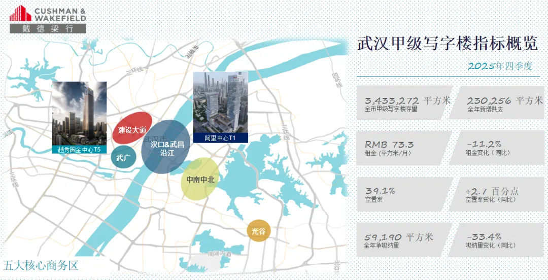 2025年武汉甲级写字楼市场新增供应约23万平方米(越秀国际金融中心T5、阿里中心T1),总存量升至343.3万平方米。受经济环境影响,企业扩张态度审慎,全年核心商务区净吸纳量仅5.9万平方米,同比下降33.4%,空置率攀升至39.1%,平均租金同比下降11.2%至73.3元/平方米/月。