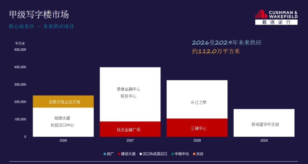 戴德梁行预测,未来四年武汉甲级写字楼市场将迎来约112万平方米新增供应,且超70%集中于汉口、武昌沿江板块。
