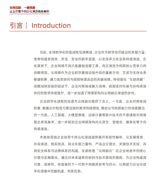 华为《企业级骨干网云化演进趋势解析报告》核心结论重磅发布:在 “东数西算” 战略与数字化转型双重驱动下,企业骨干网已从基础连接工具升级为核心竞争力载体,云网融合成为构建数字底座的关键路径,未来将围绕 “敏捷、安全、智能、弹性” 四大维度,实现 “云 - 边 - 端 - 办公” 一体化互联,为 AI 推理、跨域算力调度等场景提供毫秒级支撑。