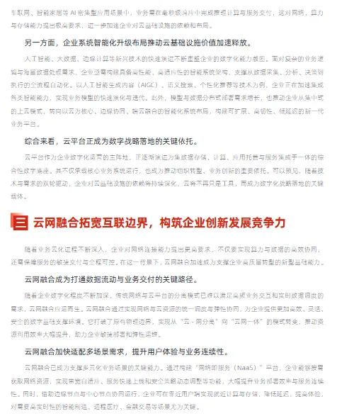 随着 AI 技术与网络深度融合,企业骨干网将迈入 “自治化” 新阶段:一方面,网络将主动感知业务意图,提供金融级、制造级等差异化 SLA 服务;另一方面,边缘计算与就近部署将成为主流,满足自动驾驶、AR/VR 等场景的毫秒级响应需求。未来,云化骨干网不仅是数据与算力的传输通道,更是企业数字化创新的 “智能中枢”,唯有提前布局云网融合,才能在数字经济竞争中抢占先机。企业需以 “业务为中心”,兼顾技术创新与安全合规,让网络真正成为新质生产力跃升的核心支撑。