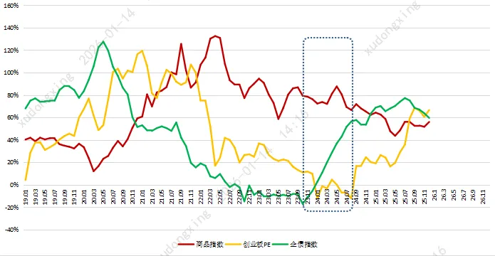 如下图所示,我们追踪商品指数、创业板PE(代表股票市场)和债券指数三者的走势。债券指数在2023年3月见底,此时股票和商品还处于下跌趋势中,特别是商品指数还在较高区域。随后股票出现了(2023年年底)较为迅速的下跌,到2024年9月份股票市场见底,在此阶段2023年3月-2024年9月期间是明显的阶段一,债券指数出现了一波明显的上涨趋势,股票和商品持续下跌,如图蓝色虚线框。