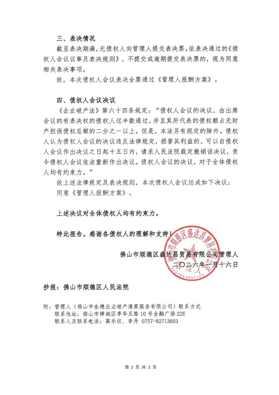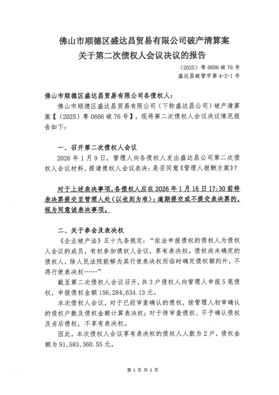 关于盛达昌公司案第二次债权人会议决议的报告