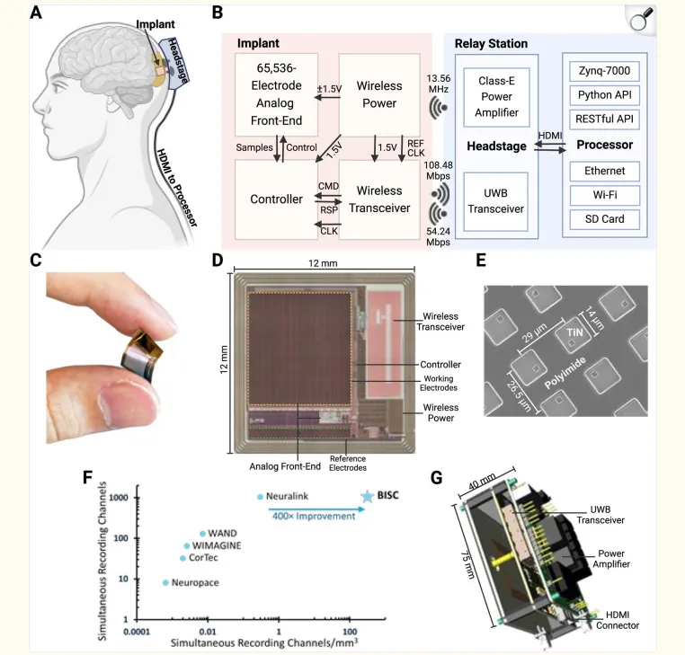 12月8日,哥伦比亚大学团队在Nature electronics上发表文章,研发了一款名为BISC(皮层生物电子接口系统) 的无线、柔性、超薄脑机接口芯片。该芯片厚度仅50 μm(约人类头发直径的一半),尺寸如指甲盖大小,却集成了65,536个电极,并能在其中实时选择记录最多1,024个通道的神经信号。
