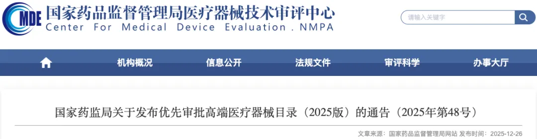 国家药监局器审中心发布:《国家药监局关于发布优先审批高端医疗器械目录(2025版)的通告(2025年第48号)》