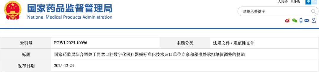 国家药监局发布:《国家药监局综合司关于同意口腔数字化医疗器械标准化技术归口单位专家和秘书处承担单位调整的复函》