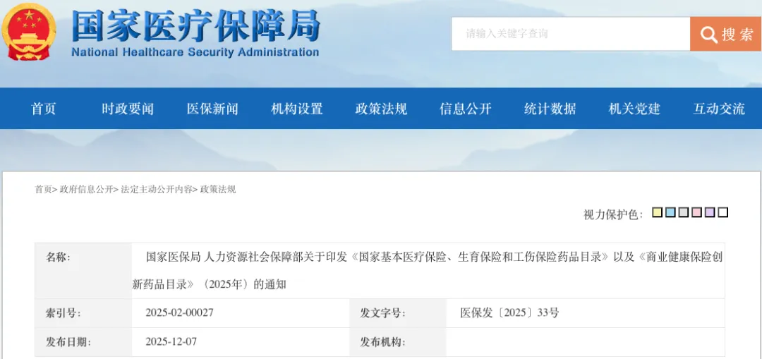 国家医保局发布:《国家医保局 人力资源社会保障部关于印发《国家基本医疗保险、生育保险和工伤保险药品目录》以及《商业健康保险创新药品目录》(2025年)的通知》