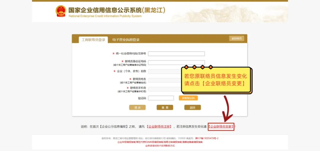 2、若【联络员身份证号码】忘记或变更,请点击【企业联络员变更】。