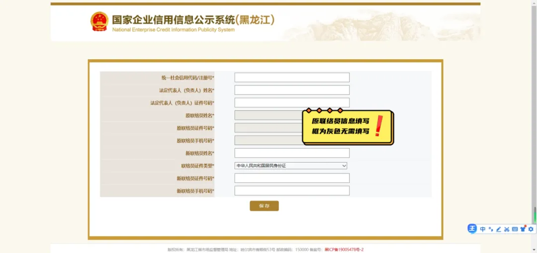 2-1、在企业联络员变更页面中原联络员信息填写框为灰色,可无需填写原联络员信息。