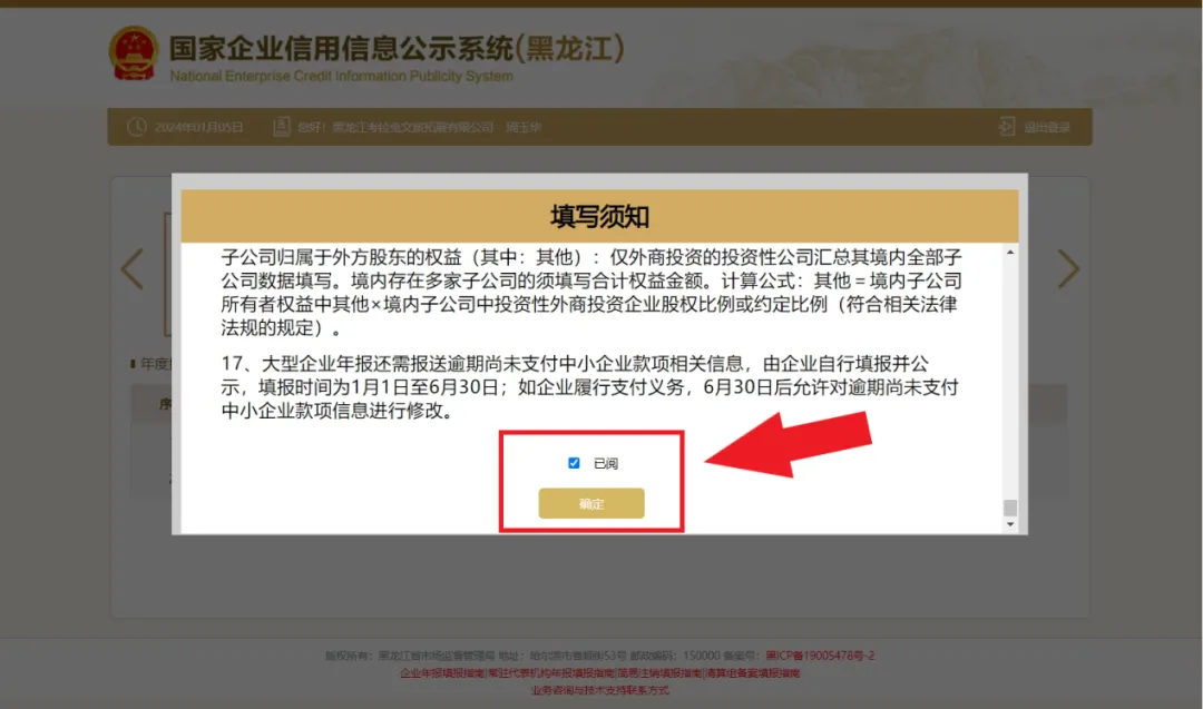 1、弹出年报须知,请在阅读后,在下方“已阅”前的小框内打上“∨”(对勾),再点确认。注意:如果存在之前没有年报的年度,需要先补报年报后才可继续申报本年度年报。