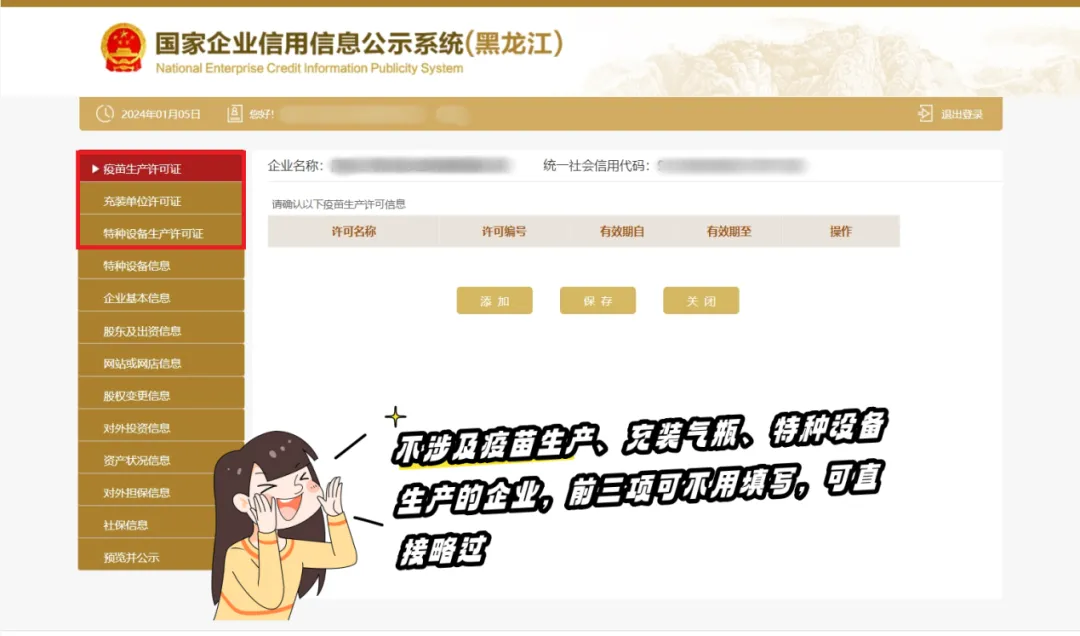 2、登录成功后,如不涉及疫苗生产、充装气瓶、特种设备生产的企业,前三项可不用填写,可直接略过。