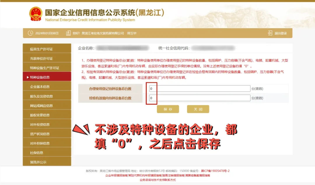 3、如不涉及特种设备的企业,都填“0”,之后点击保存。