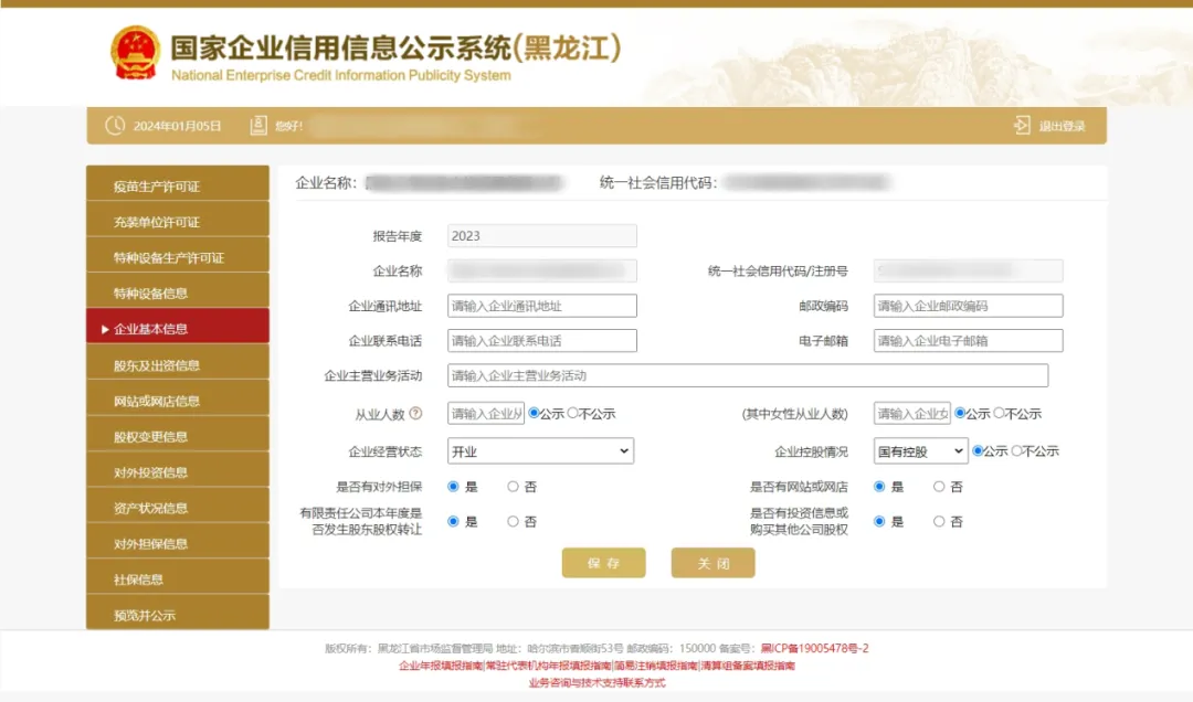 4、【企业基本信息】页面,按照实际情况填写企业的基本信息,需要填报的企业通信地址、邮政编码、联系电话、电子邮箱、经营状态、控股情况等均为报送时的信息。