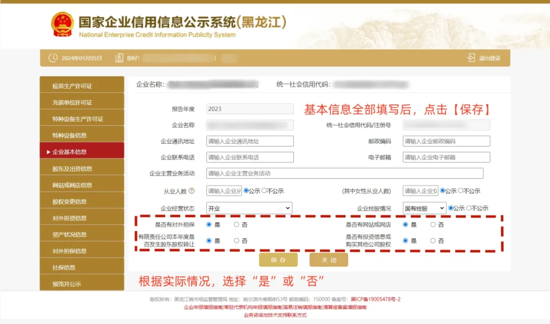 4-1、【企业基本信息】页面,如果有对外担保、网站或网点、股东股权转让、有投资信息或购买其他公司股权,就点 “是”字前的圆点,如果没有就点“否”字前的圆点。基本信息全部填写后点击“保存”。