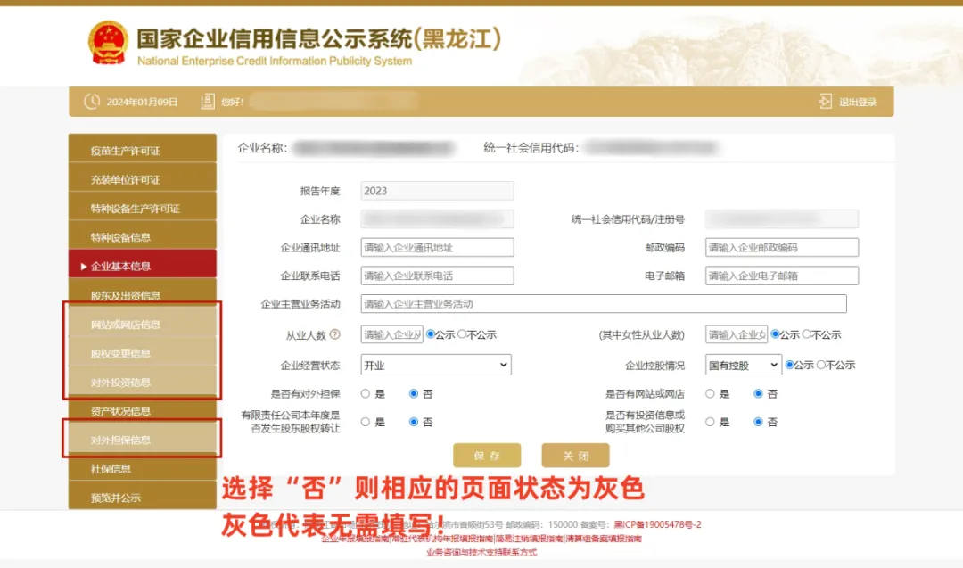 10、【对外担保信息】请根据企业实际情况填报,上一年度没有对外担保的企业,请在【企业基本信息】页面中“是否有对外担保”选择“否”,则【对外担保信息】页面状态为灰色,无需填写。