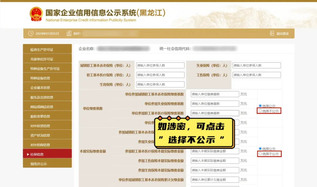 11、【社保信息】页面,填报企业的社保信息,如涉密可点击“选择不公示”但必须填写。