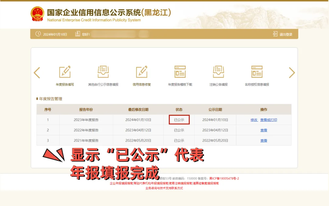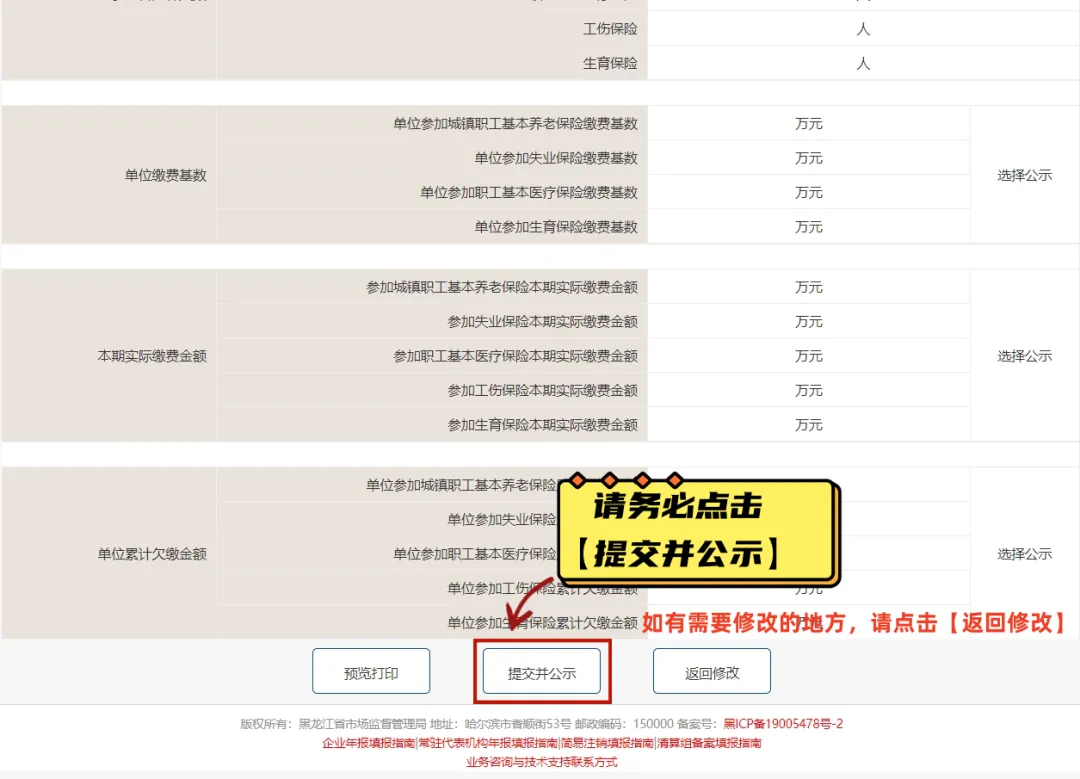 注意:年报内容填写准确、完整后请务必点击最后“提交并公示”,否则不能完成年报。