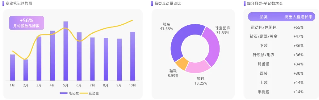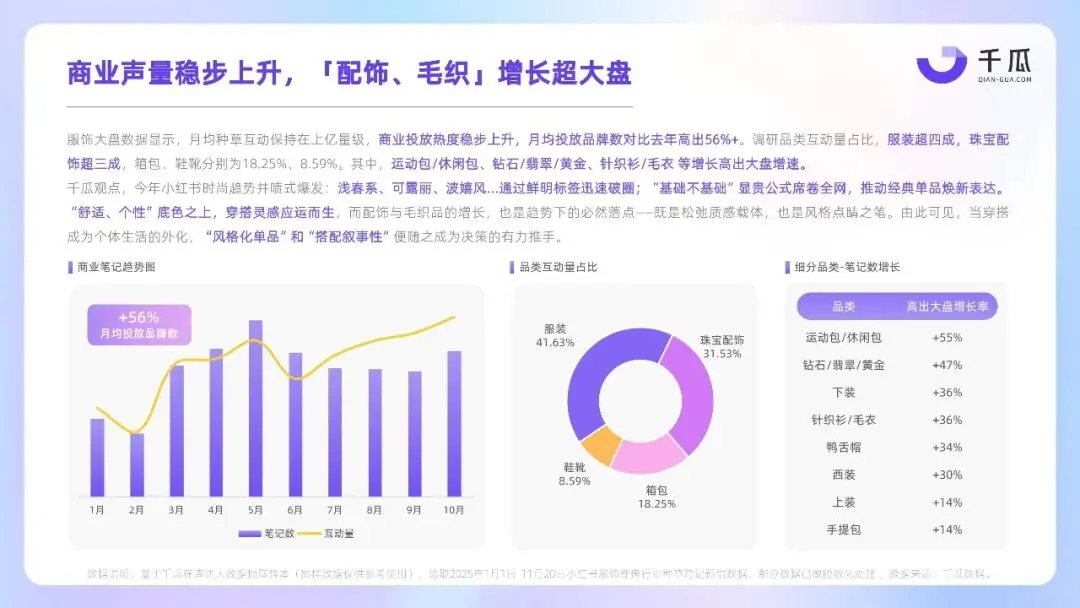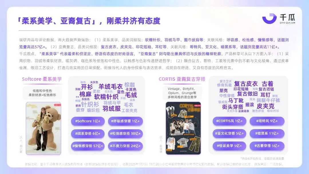 服饰行业商业声量稳步提升,月均投放品牌数同比增长超56%。在细分品类中,“配饰”与“毛织品”增长尤为突出,反映用户越来越重视单品的搭配叙事与风格表达。“柔系美学”与“亚裔复古”成为两大主流趋势,前者以软糯材质、低饱和色彩传递松弛态度,后者则融合复古、哥特等元素,展现怀旧与反叛并存的精神面貌。穿搭已从外在装饰,演变为个体生活态度与情感的外化。