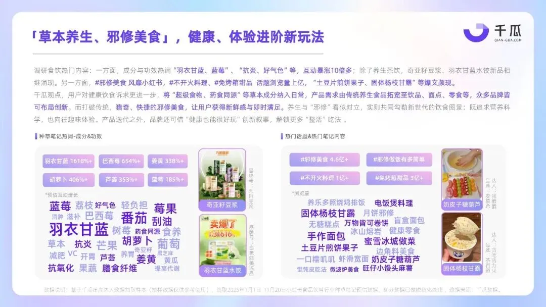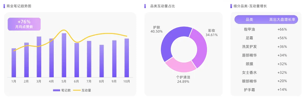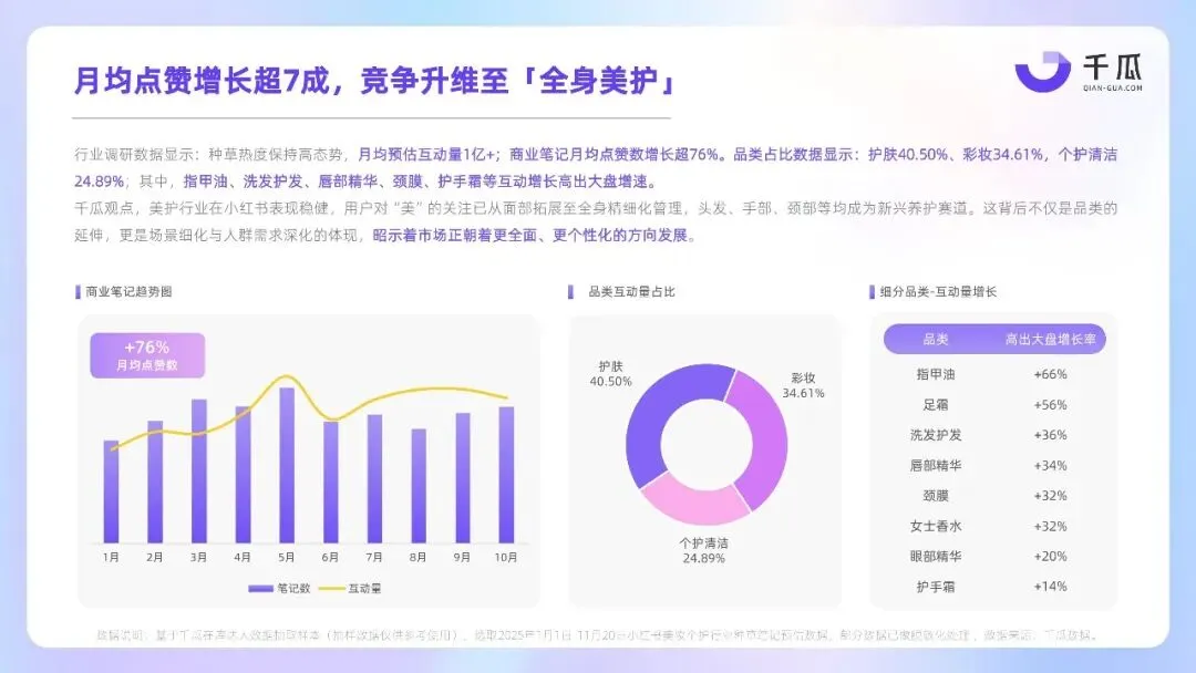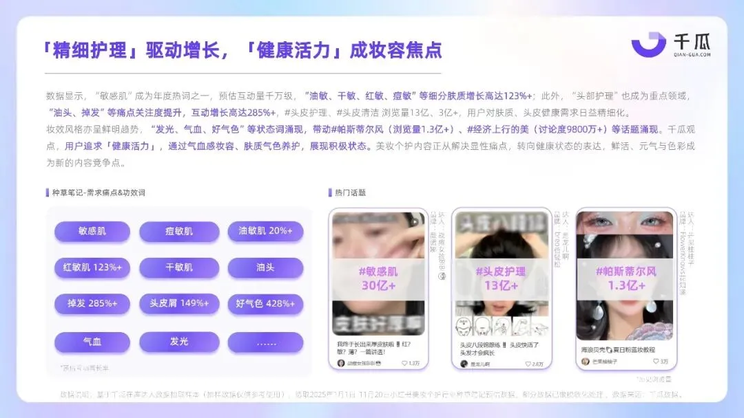美妆个护领域月均点赞量增长超76%,用户对“美”的关注从面部延伸至全身精细化护理。“敏感肌”成为年度热词,相关互动量达千万级,而“头部护理”相关内容的互动增长更高达285%。妆容风格上,“发光肌”“气血感”等健康状态关键词走红,显示用户追求的不再只是遮盖瑕疵,而是由内而外的健康活力表达。