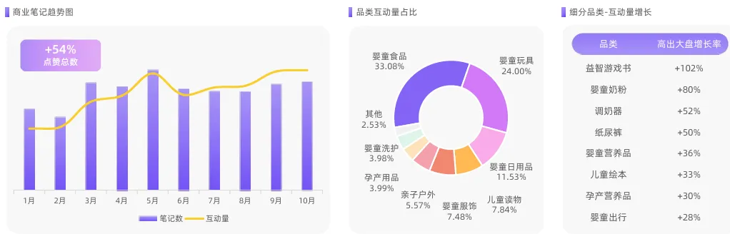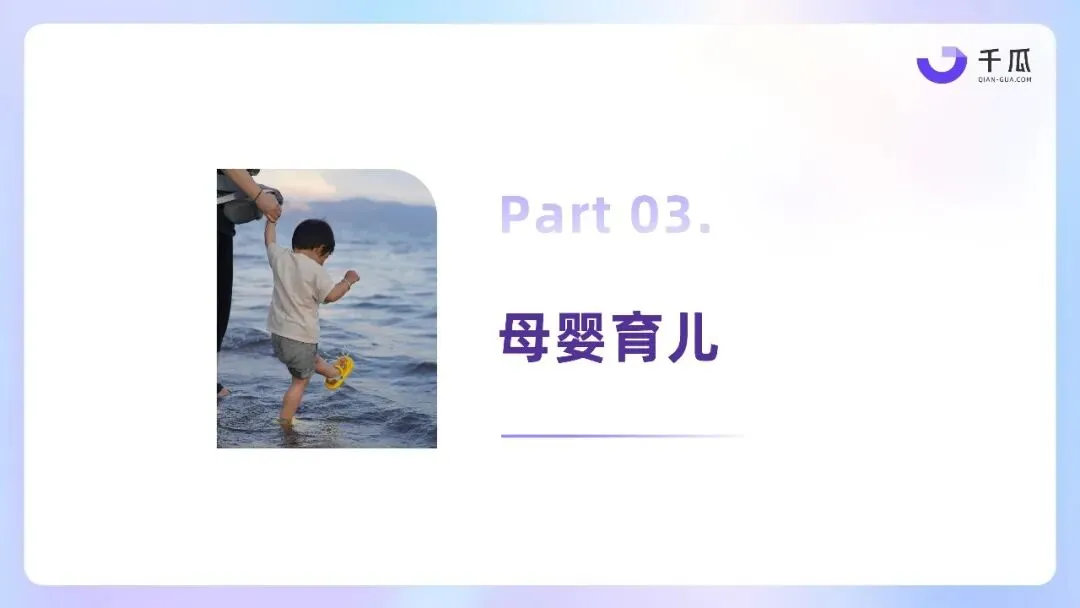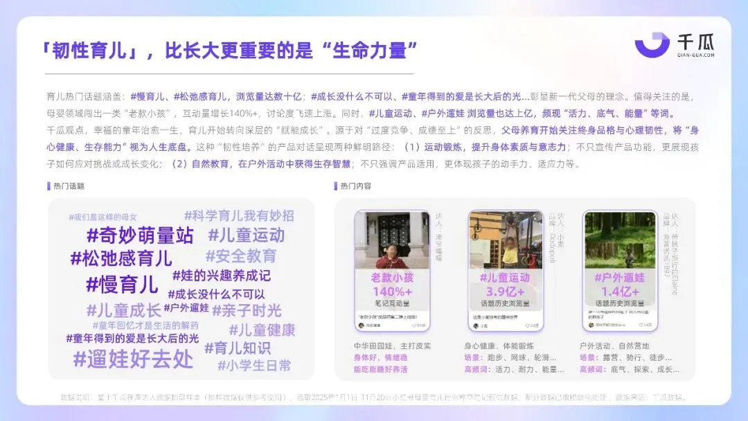 母婴内容互动认可度明显提升,点赞总数增长超50%。除了婴童食品、日用品等刚需品类外,玩具、读物、户外等内容增长迅速,呼应“韧性育儿”理念的兴起。父母不再只关注成绩,更重视孩子的身心韧性、生存能力与生命能量。运动锻炼与自然探索成为内容热点,育儿正向“赋能成长”深度演进。