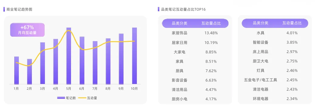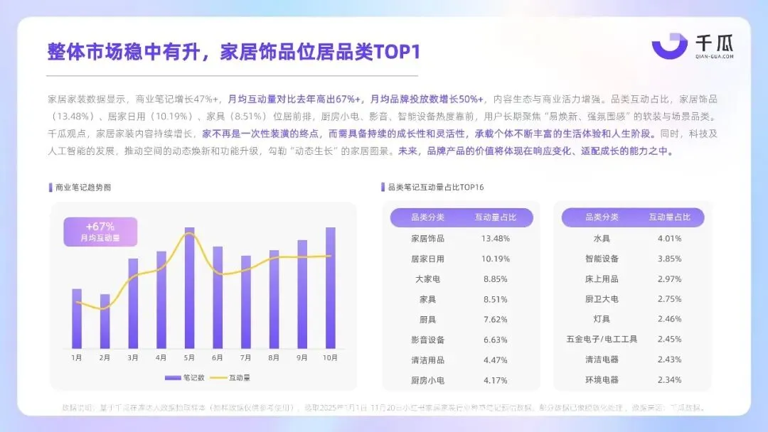 家居家装商业笔记增长超47%,用户愈发重视家的“可成长性”。“家居饰品”位居互动占比榜首,反映人们对软装与氛围感的持续关注。趋势上,“适我化设计”与“感官智能”成为关键词,家的意义从标准化功能转向个性化承载,AI等技术也帮助用户实现光照、温度等感官体验的定制化。